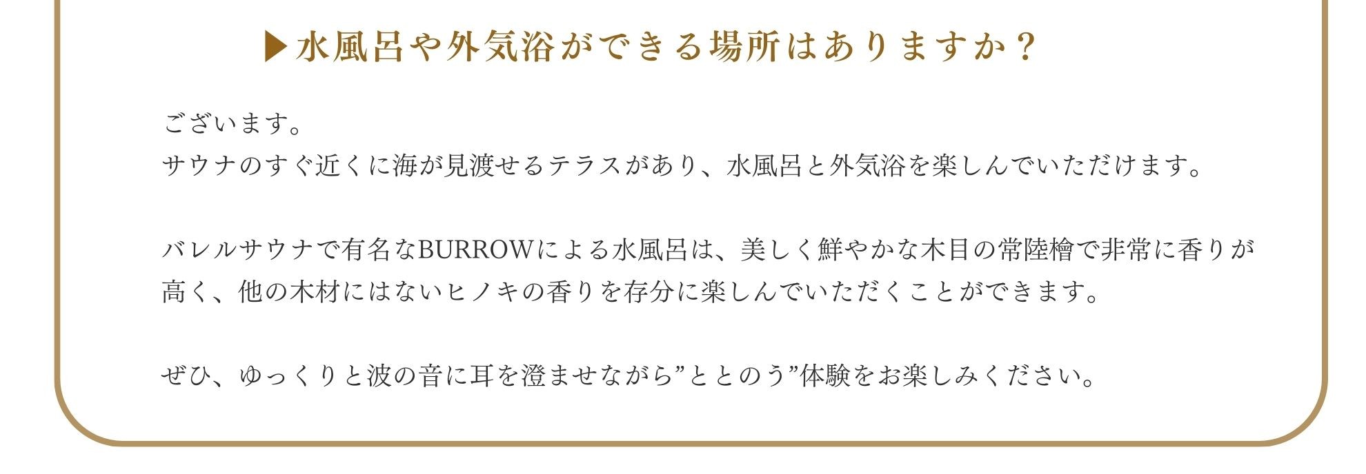 シーサイドテラス千葉鴨川と同じ千葉県鴨川市江見エリアの、グループ施設『VILLA藍水-ransui-』。プライベートオーシャンビューヴィラの『VILLA藍水-ransui-』は、全棟にプール、温泉、絶景オーシャンビューのダイニングスペースを備えたラグジュアリーな空間でのグランピング体験をお楽しみいただけます。わんちゃん同伴可能なお部屋もございます。