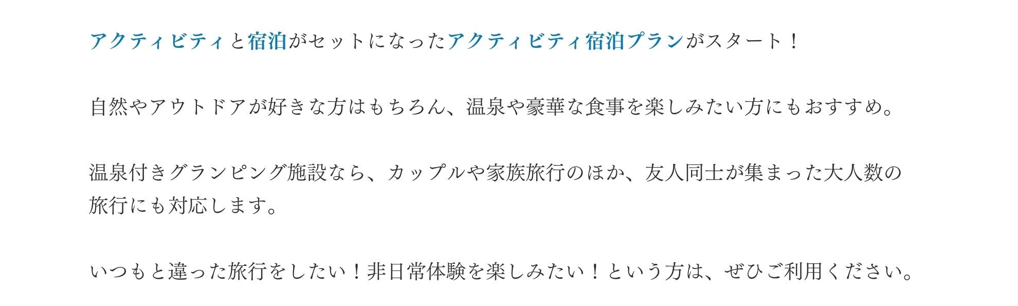 都心から60分とアクセスの良い千葉県富津市に全20棟の関東最大級のグランピングリゾートが誕生。5タイプのドーム型グランピングと アウトドアヴィラの全6タイプのお部屋は、温泉&プライベートプール付き、 プライベートサウナ付き、キャンプファイヤー付き、ペット同伴可などそれぞれに特徴をもっており、 楽しみ方や過ごし方も変わります。